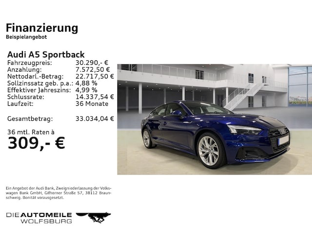 Voor zakelijke klanten bieden wij optioneel een financial lease oplossing en voor particuliere klanten een persoonlijke lening. Met onderstaande module kunt u uw maandbedrag berekenen voor het financieren van bovenstaande Audi A5.