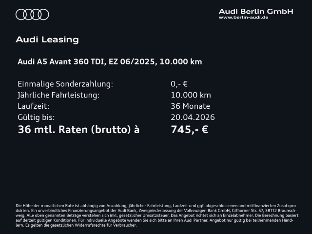 Voor zakelijke klanten bieden wij optioneel een financial lease oplossing en voor particuliere klanten een persoonlijke lening. Met onderstaande module kunt u uw maandbedrag berekenen voor het financieren van bovenstaande Audi A5.