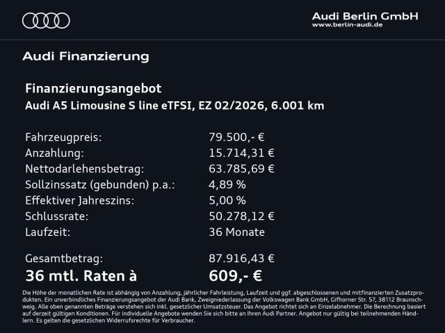 Voor zakelijke klanten bieden wij optioneel een financial lease oplossing en voor particuliere klanten een persoonlijke lening. Met onderstaande module kunt u uw maandbedrag berekenen voor het financieren van bovenstaande Audi A5.