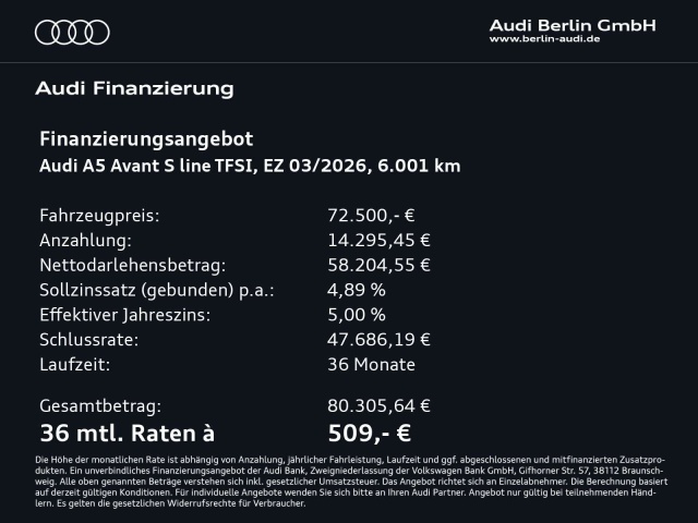 Voor zakelijke klanten bieden wij optioneel een financial lease oplossing en voor particuliere klanten een persoonlijke lening. Met onderstaande module kunt u uw maandbedrag berekenen voor het financieren van bovenstaande Audi A5.