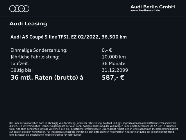 Voor zakelijke klanten bieden wij optioneel een financial lease oplossing en voor particuliere klanten een persoonlijke lening. Met onderstaande module kunt u uw maandbedrag berekenen voor het financieren van bovenstaande Audi A5.