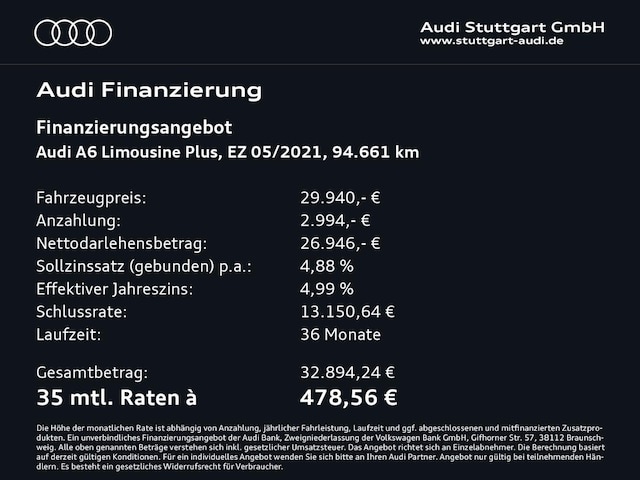 Voor zakelijke klanten bieden wij optioneel een financial lease oplossing en voor particuliere klanten een persoonlijke lening. Met onderstaande module kunt u uw maandbedrag berekenen voor het financieren van bovenstaande Audi A6.