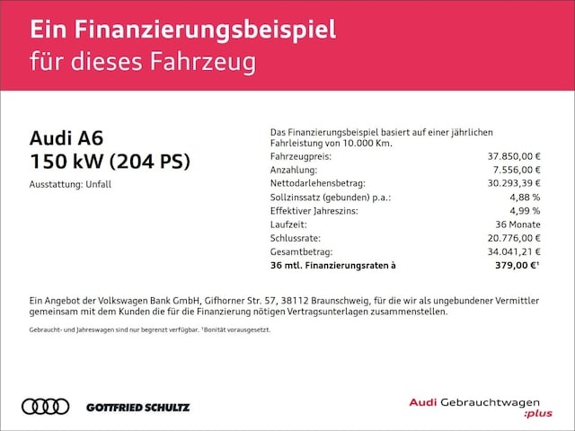 Voor zakelijke klanten bieden wij optioneel een financial lease oplossing en voor particuliere klanten een persoonlijke lening. Met onderstaande module kunt u uw maandbedrag berekenen voor het financieren van bovenstaande Audi A6.