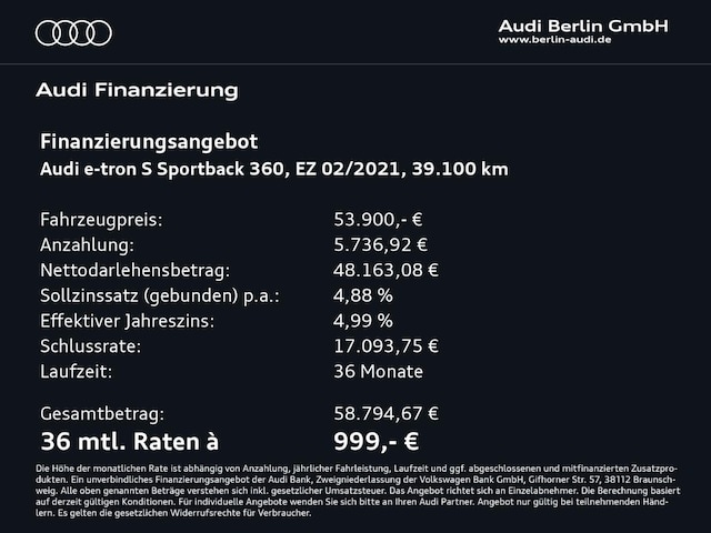 Voor zakelijke klanten bieden wij optioneel een financial lease oplossing en voor particuliere klanten een persoonlijke lening. Met onderstaande module kunt u uw maandbedrag berekenen voor het financieren van bovenstaande Audi e-tron S.
