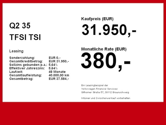 Voor zakelijke klanten bieden wij optioneel een financial lease oplossing en voor particuliere klanten een persoonlijke lening. Met onderstaande module kunt u uw maandbedrag berekenen voor het financieren van bovenstaande Audi Q2.