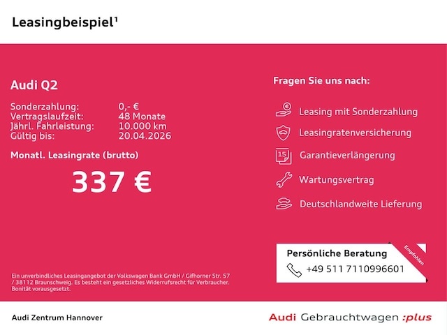 Voor zakelijke klanten bieden wij optioneel een financial lease oplossing en voor particuliere klanten een persoonlijke lening. Met onderstaande module kunt u uw maandbedrag berekenen voor het financieren van bovenstaande Audi Q2.