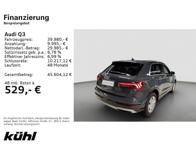 Voor zakelijke klanten bieden wij optioneel een financial lease oplossing en voor particuliere klanten een persoonlijke lening. Met onderstaande module kunt u uw maandbedrag berekenen voor het financieren van bovenstaande Audi Q3.