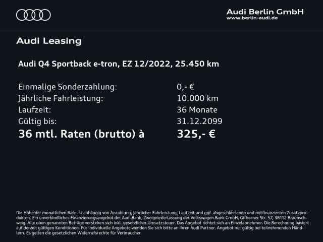 Voor zakelijke klanten bieden wij optioneel een financial lease oplossing en voor particuliere klanten een persoonlijke lening. Met onderstaande module kunt u uw maandbedrag berekenen voor het financieren van bovenstaande Audi Q4 e-tron.
