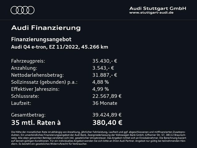 Voor zakelijke klanten bieden wij optioneel een financial lease oplossing en voor particuliere klanten een persoonlijke lening. Met onderstaande module kunt u uw maandbedrag berekenen voor het financieren van bovenstaande Audi Q4.