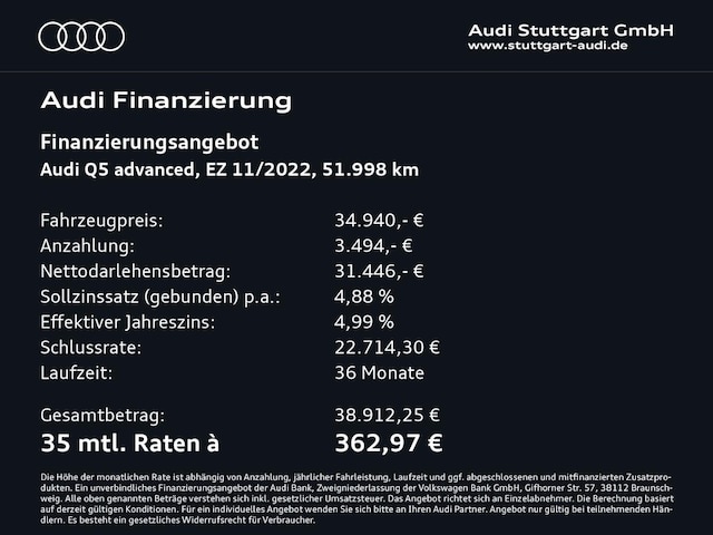 Voor zakelijke klanten bieden wij optioneel een financial lease oplossing en voor particuliere klanten een persoonlijke lening. Met onderstaande module kunt u uw maandbedrag berekenen voor het financieren van bovenstaande Audi Q5.