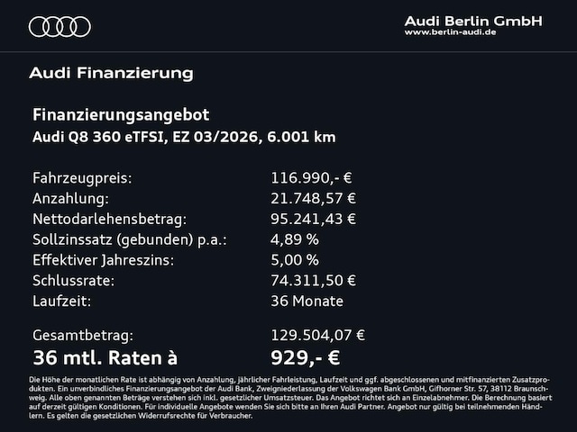 Voor zakelijke klanten bieden wij optioneel een financial lease oplossing en voor particuliere klanten een persoonlijke lening. Met onderstaande module kunt u uw maandbedrag berekenen voor het financieren van bovenstaande Audi Q8 TFSI e.