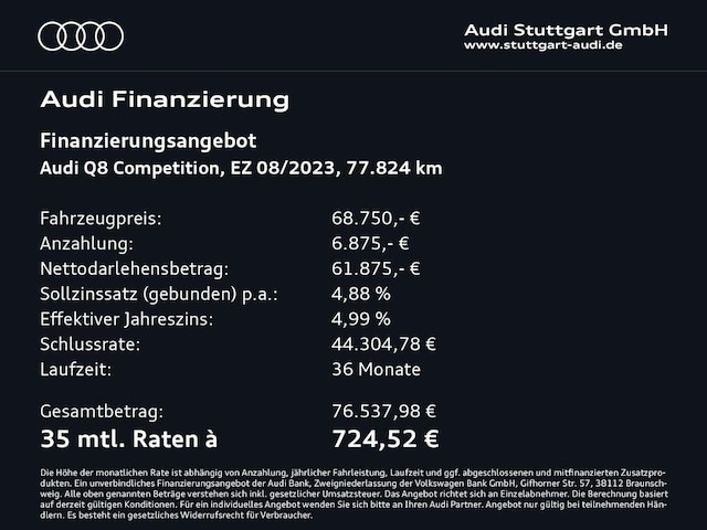Voor zakelijke klanten bieden wij optioneel een financial lease oplossing en voor particuliere klanten een persoonlijke lening. Met onderstaande module kunt u uw maandbedrag berekenen voor het financieren van bovenstaande Audi Q8.