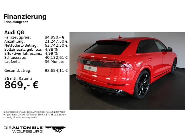 Voor zakelijke klanten bieden wij optioneel een financial lease oplossing en voor particuliere klanten een persoonlijke lening. Met onderstaande module kunt u uw maandbedrag berekenen voor het financieren van bovenstaande Audi Q8.