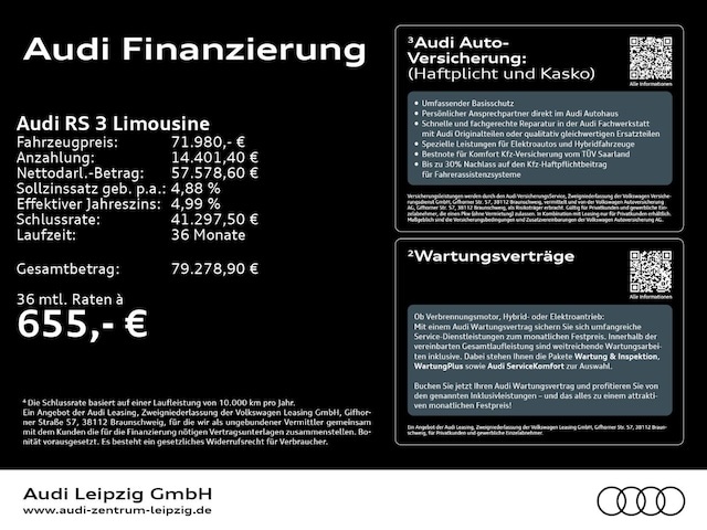 Voor zakelijke klanten bieden wij optioneel een financial lease oplossing en voor particuliere klanten een persoonlijke lening. Met onderstaande module kunt u uw maandbedrag berekenen voor het financieren van bovenstaande Audi RS3.