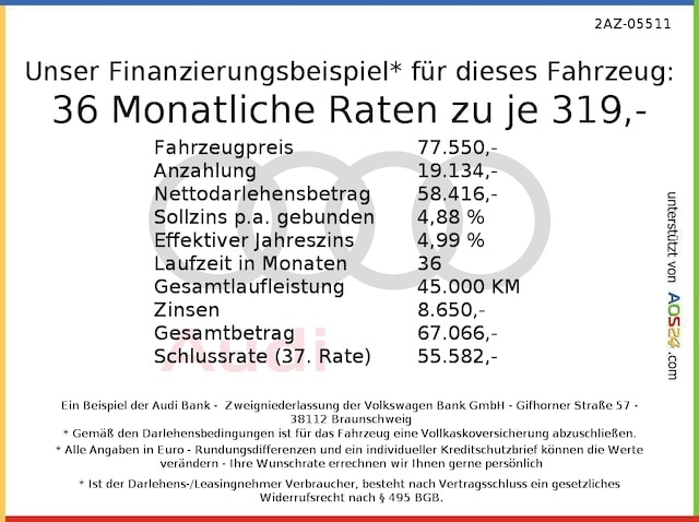Voor zakelijke klanten bieden wij optioneel een financial lease oplossing en voor particuliere klanten een persoonlijke lening. Met onderstaande module kunt u uw maandbedrag berekenen voor het financieren van bovenstaande Audi RS4.