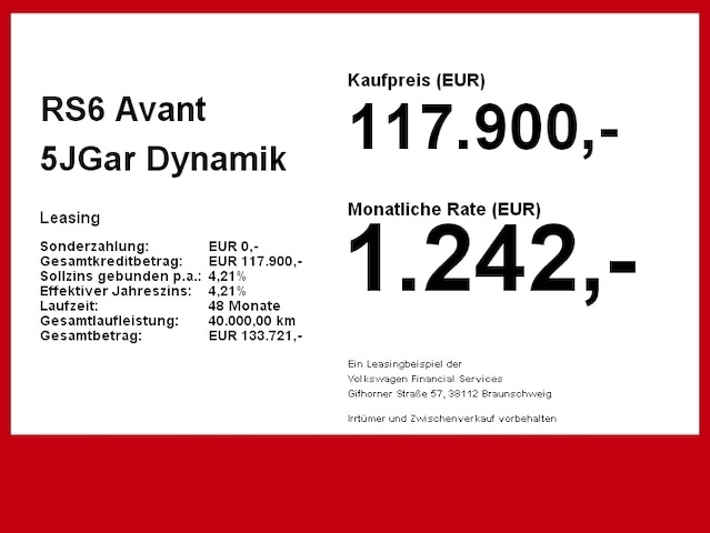 Voor zakelijke klanten bieden wij optioneel een financial lease oplossing en voor particuliere klanten een persoonlijke lening. Met onderstaande module kunt u uw maandbedrag berekenen voor het financieren van bovenstaande Audi RS6.