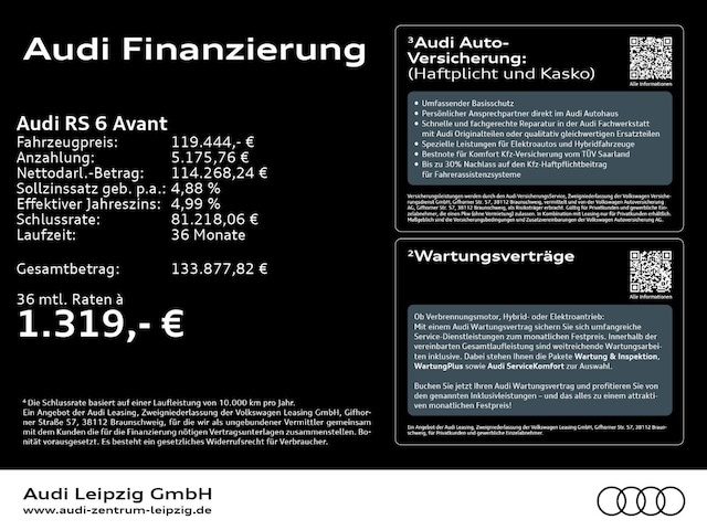 Voor zakelijke klanten bieden wij optioneel een financial lease oplossing en voor particuliere klanten een persoonlijke lening. Met onderstaande module kunt u uw maandbedrag berekenen voor het financieren van bovenstaande Audi RS6.