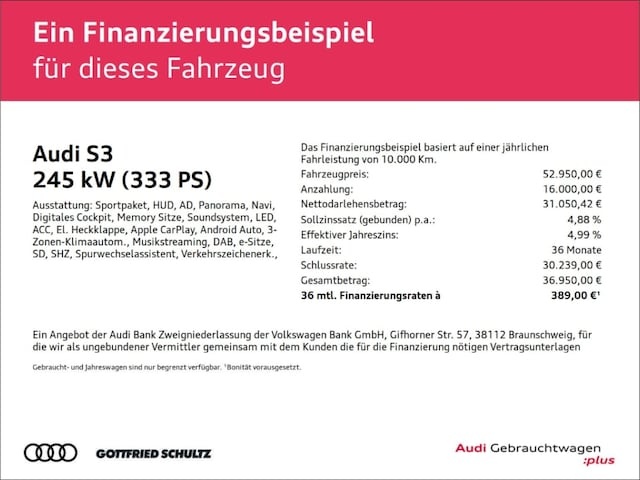 Voor zakelijke klanten bieden wij optioneel een financial lease oplossing en voor particuliere klanten een persoonlijke lening. Met onderstaande module kunt u uw maandbedrag berekenen voor het financieren van bovenstaande Audi S3.