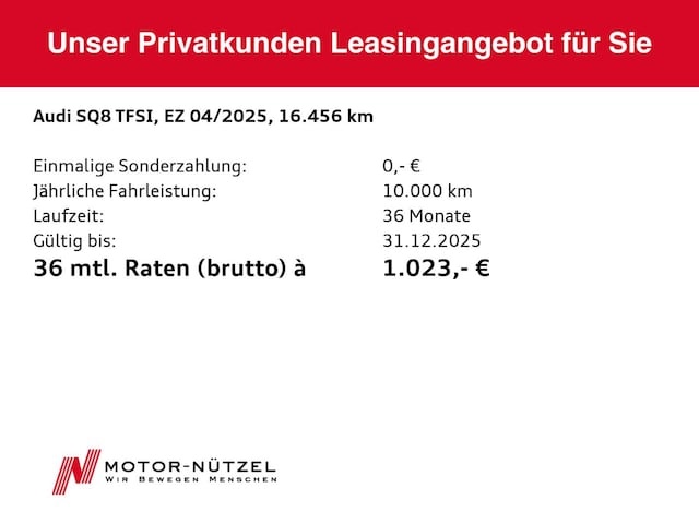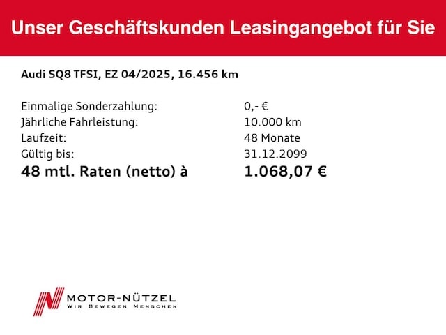 Voor zakelijke klanten bieden wij optioneel een financial lease oplossing en voor particuliere klanten een persoonlijke lening. Met onderstaande module kunt u uw maandbedrag berekenen voor het financieren van bovenstaande Audi SQ8.