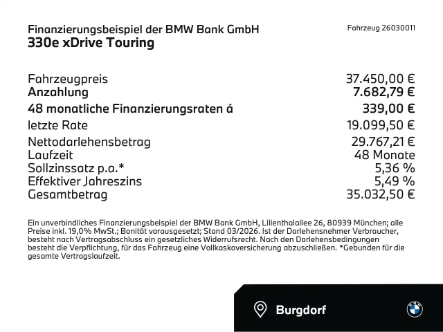Voor zakelijke klanten bieden wij optioneel een financial lease oplossing en voor particuliere klanten een persoonlijke lening. Met onderstaande module kunt u uw maandbedrag berekenen voor het financieren van bovenstaande BMW 330.