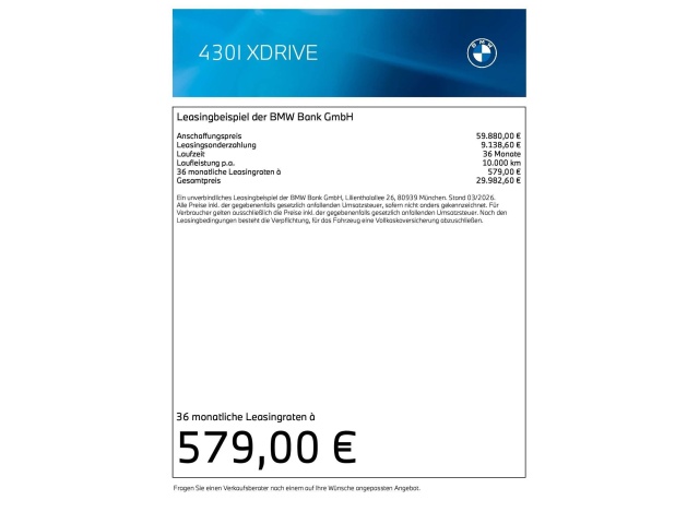 Voor zakelijke klanten bieden wij optioneel een financial lease oplossing en voor particuliere klanten een persoonlijke lening. Met onderstaande module kunt u uw maandbedrag berekenen voor het financieren van bovenstaande BMW 430.