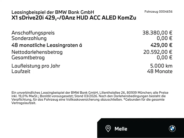 Voor zakelijke klanten bieden wij optioneel een financial lease oplossing en voor particuliere klanten een persoonlijke lening. Met onderstaande module kunt u uw maandbedrag berekenen voor het financieren van bovenstaande BMW X1.