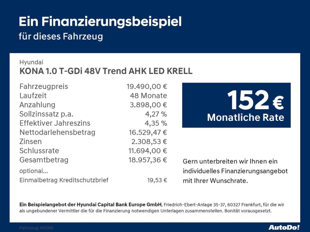 Voor zakelijke klanten bieden wij optioneel een financial lease oplossing en voor particuliere klanten een persoonlijke lening. Met onderstaande module kunt u uw maandbedrag berekenen voor het financieren van bovenstaande Hyundai Kona.