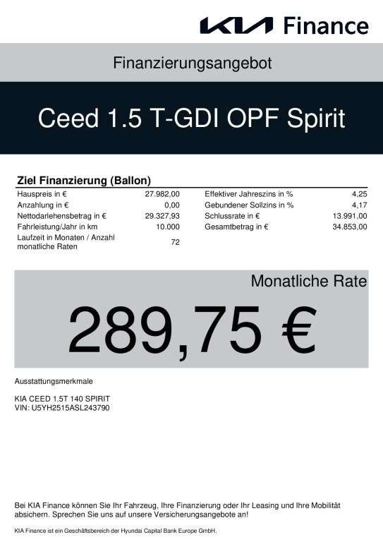 Voor zakelijke klanten bieden wij optioneel een financial lease oplossing en voor particuliere klanten een persoonlijke lening. Met onderstaande module kunt u uw maandbedrag berekenen voor het financieren van bovenstaande Kia Cee'd.