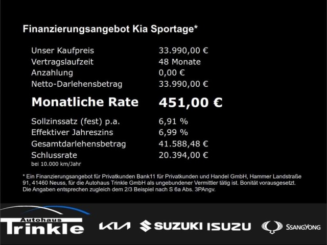 Voor zakelijke klanten bieden wij optioneel een financial lease oplossing en voor particuliere klanten een persoonlijke lening. Met onderstaande module kunt u uw maandbedrag berekenen voor het financieren van bovenstaande Kia Sportage.