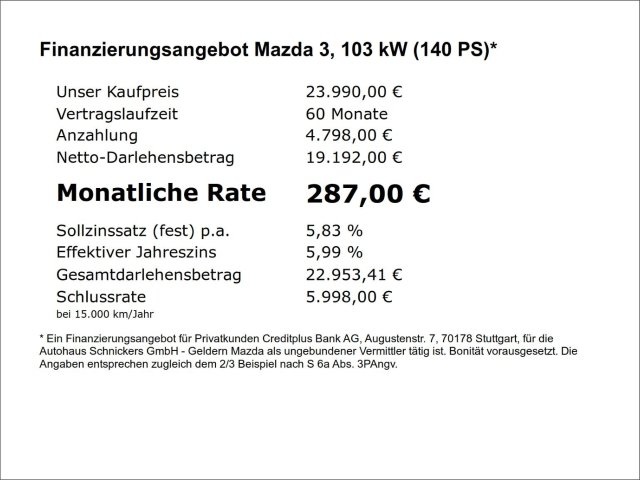 Voor zakelijke klanten bieden wij optioneel een financial lease oplossing en voor particuliere klanten een persoonlijke lening. Met onderstaande module kunt u uw maandbedrag berekenen voor het financieren van bovenstaande Mazda 3.