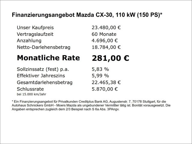 Voor zakelijke klanten bieden wij optioneel een financial lease oplossing en voor particuliere klanten een persoonlijke lening. Met onderstaande module kunt u uw maandbedrag berekenen voor het financieren van bovenstaande Mazda CX-30.