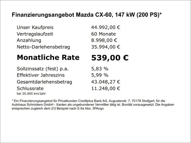 Voor zakelijke klanten bieden wij optioneel een financial lease oplossing en voor particuliere klanten een persoonlijke lening. Met onderstaande module kunt u uw maandbedrag berekenen voor het financieren van bovenstaande Mazda CX-60.