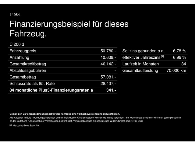 Voor zakelijke klanten bieden wij optioneel een financial lease oplossing en voor particuliere klanten een persoonlijke lening. Met onderstaande module kunt u uw maandbedrag berekenen voor het financieren van bovenstaande Mercedes-Benz C 200.