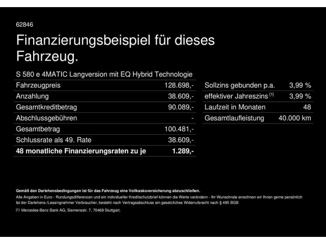Voor zakelijke klanten bieden wij optioneel een financial lease oplossing en voor particuliere klanten een persoonlijke lening. Met onderstaande module kunt u uw maandbedrag berekenen voor het financieren van bovenstaande Mercedes-Benz S 580.