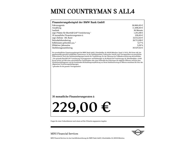 Voor zakelijke klanten bieden wij optioneel een financial lease oplossing en voor particuliere klanten een persoonlijke lening. Met onderstaande module kunt u uw maandbedrag berekenen voor het financieren van bovenstaande MINI Cooper S Countryman.