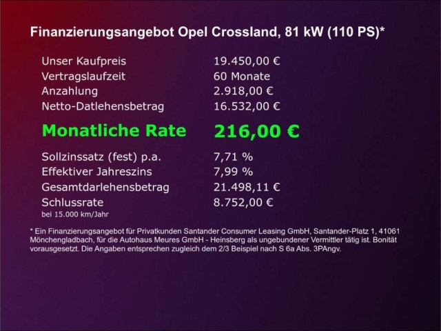 Voor zakelijke klanten bieden wij optioneel een financial lease oplossing en voor particuliere klanten een persoonlijke lening. Met onderstaande module kunt u uw maandbedrag berekenen voor het financieren van bovenstaande Opel Crossland.