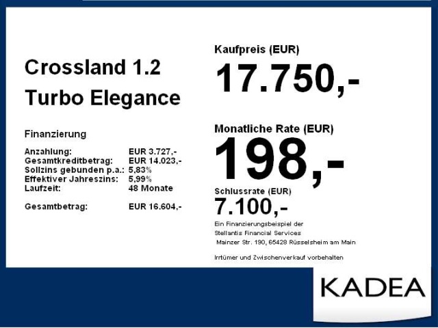 Voor zakelijke klanten bieden wij optioneel een financial lease oplossing en voor particuliere klanten een persoonlijke lening. Met onderstaande module kunt u uw maandbedrag berekenen voor het financieren van bovenstaande Opel Crossland.