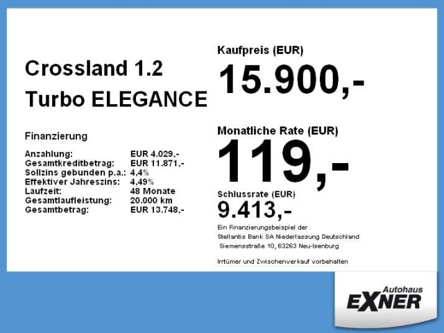 Voor zakelijke klanten bieden wij optioneel een financial lease oplossing en voor particuliere klanten een persoonlijke lening. Met onderstaande module kunt u uw maandbedrag berekenen voor het financieren van bovenstaande Opel Crossland.