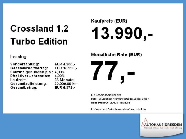 Voor zakelijke klanten bieden wij optioneel een financial lease oplossing en voor particuliere klanten een persoonlijke lening. Met onderstaande module kunt u uw maandbedrag berekenen voor het financieren van bovenstaande Opel Crossland.