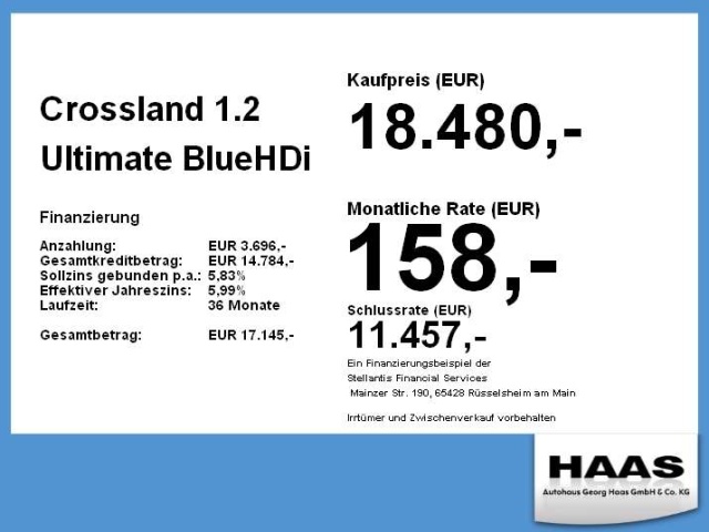 Voor zakelijke klanten bieden wij optioneel een financial lease oplossing en voor particuliere klanten een persoonlijke lening. Met onderstaande module kunt u uw maandbedrag berekenen voor het financieren van bovenstaande Opel Crossland.