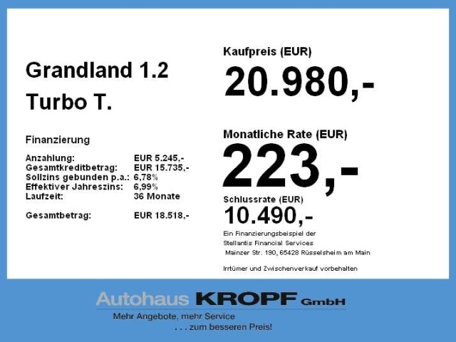 In de Duitse advertentie van deze Opel Grandland staat een CO2-uitstoot vermeld van 143 gram per km. Op basis daarvan hebben wij geautomatiseerd een indicatief rest-BPM bedrag van € 2.245 berekend op basis van de afschrijvingstabel van de Belastingdienst. Een handmatige BPM berekening o.b.v. een waardebepaling leidt voor jonge auto's vaak tot een lager rest-BPM bedrag. Vraag hiertoe een offerte aan, vaak kunnen we daar een besparing voor u realiseren. Om hiervoor een fiscaal akkoord te krijgen zal de BPM aangifte worden aangevuld met een waardebepaling taxatierapport. Wij rekenen een fee voor onze bemiddeling hierin. Uiteraard alleen wanneer dit rendabel is.