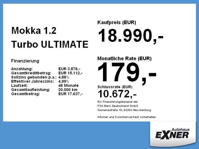 Voor zakelijke klanten bieden wij optioneel een financial lease oplossing en voor particuliere klanten een persoonlijke lening. Met onderstaande module kunt u uw maandbedrag berekenen voor het financieren van bovenstaande Opel Mokka.