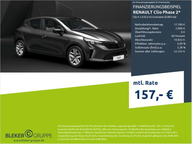 Voor zakelijke klanten bieden wij optioneel een financial lease oplossing en voor particuliere klanten een persoonlijke lening. Met onderstaande module kunt u uw maandbedrag berekenen voor het financieren van bovenstaande Renault Clio.