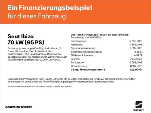 Voor zakelijke klanten bieden wij optioneel een financial lease oplossing en voor particuliere klanten een persoonlijke lening. Met onderstaande module kunt u uw maandbedrag berekenen voor het financieren van bovenstaande Seat Ibiza.