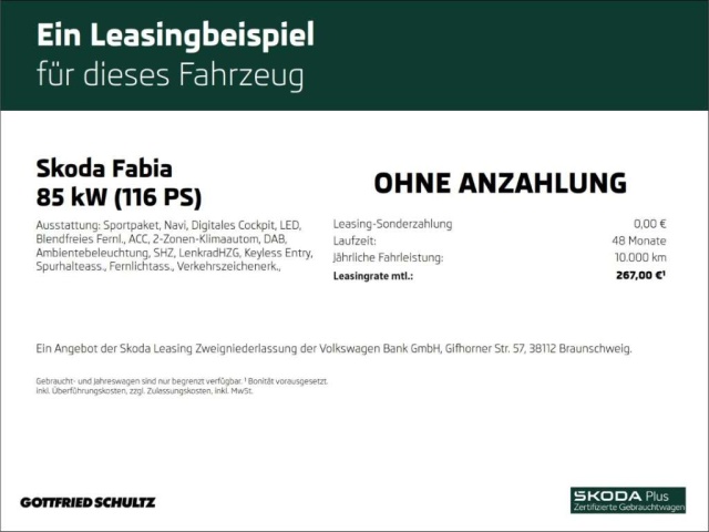 Voor zakelijke klanten bieden wij optioneel een financial lease oplossing en voor particuliere klanten een persoonlijke lening. Met onderstaande module kunt u uw maandbedrag berekenen voor het financieren van bovenstaande Skoda Fabia.