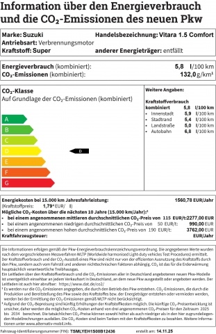 In de Duitse advertentie van deze Suzuki Vitara staat een CO2-uitstoot vermeld van 132 gram per km. Op basis daarvan hebben wij geautomatiseerd een indicatief rest-BPM bedrag van € 7.543 berekend op basis van de afschrijvingstabel van de Belastingdienst. Een handmatige BPM berekening o.b.v. een waardebepaling leidt voor jonge auto's vaak tot een lager rest-BPM bedrag. Vraag hiertoe een offerte aan, vaak kunnen we daar een besparing voor u realiseren. Om hiervoor een fiscaal akkoord te krijgen zal de BPM aangifte worden aangevuld met een waardebepaling taxatierapport. Wij rekenen een fee voor onze bemiddeling hierin. Uiteraard alleen wanneer dit rendabel is.