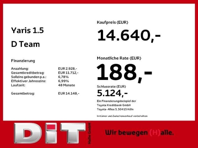Voor zakelijke klanten bieden wij optioneel een financial lease oplossing en voor particuliere klanten een persoonlijke lening. Met onderstaande module kunt u uw maandbedrag berekenen voor het financieren van bovenstaande Toyota Yaris.
