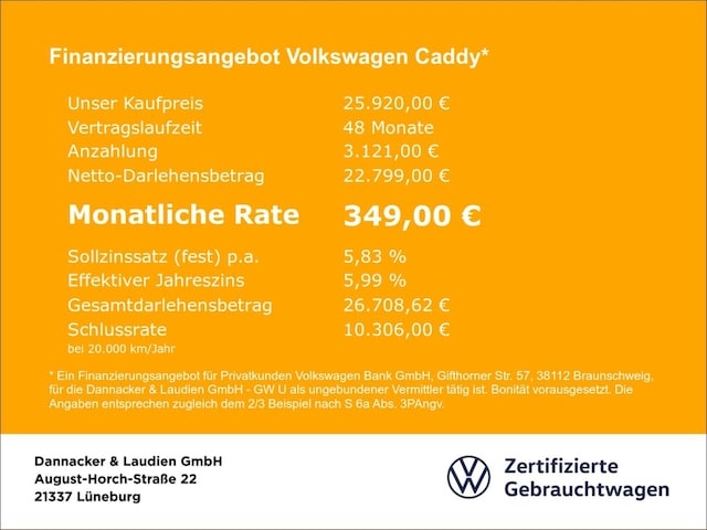 Voor zakelijke klanten bieden wij optioneel een financial lease oplossing en voor particuliere klanten een persoonlijke lening. Met onderstaande module kunt u uw maandbedrag berekenen voor het financieren van bovenstaande Volkswagen Caddy.