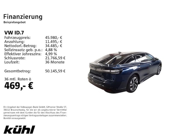 Voor zakelijke klanten bieden wij optioneel een financial lease oplossing en voor particuliere klanten een persoonlijke lening. Met onderstaande module kunt u uw maandbedrag berekenen voor het financieren van bovenstaande Volkswagen ID.7.