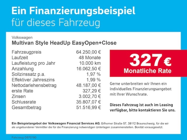 Voor zakelijke klanten bieden wij optioneel een financial lease oplossing en voor particuliere klanten een persoonlijke lening. Met onderstaande module kunt u uw maandbedrag berekenen voor het financieren van bovenstaande Volkswagen Multivan.